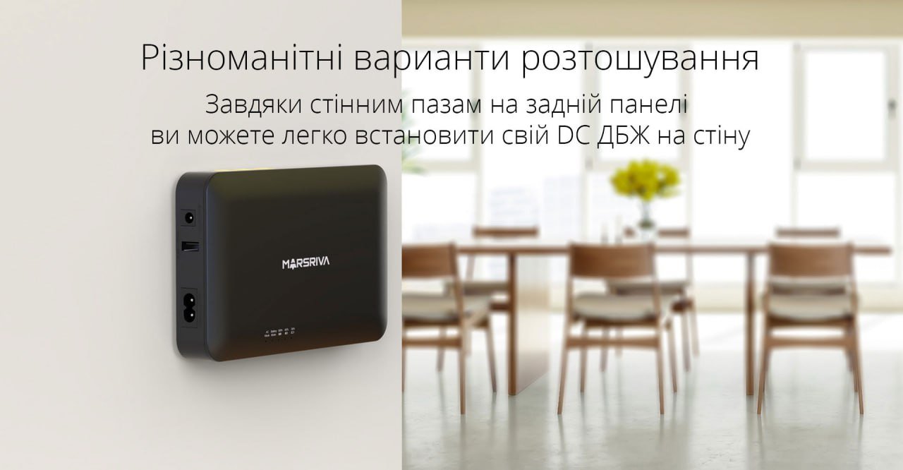Компактне джерело безперебійного живлення, сумісне з маршрутизатором, абонентським оптичним терміналом, камерою відеоспостереження, смартфоном, світлодіодними стрічками. Вбудований літієвий акумулятор ємністю 10000 мАг забезпечує ємність 37 Вт*год, 4 порти напруги постійного струму та порт USB для одночасного живлення. Ідеально підходить для використання у випадку відключення електроенергії.