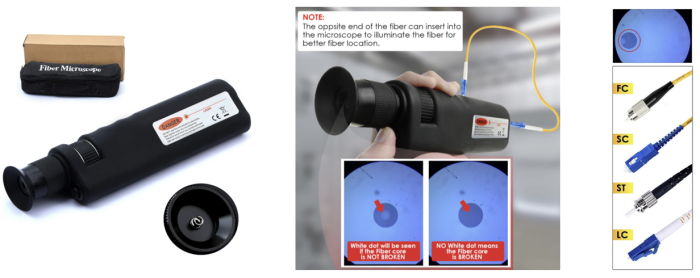 Ручний мікроскоп CL-400X із збільшенням у 400 разів. Використовується для перевірки чистоти ферул оптичних конекторів. У комплекті йдуть адаптери для 1.25 мм та 2.5 мм ферули, вбудований захисний лазерний фільтр, робота від трьох батарейок типу ААА.