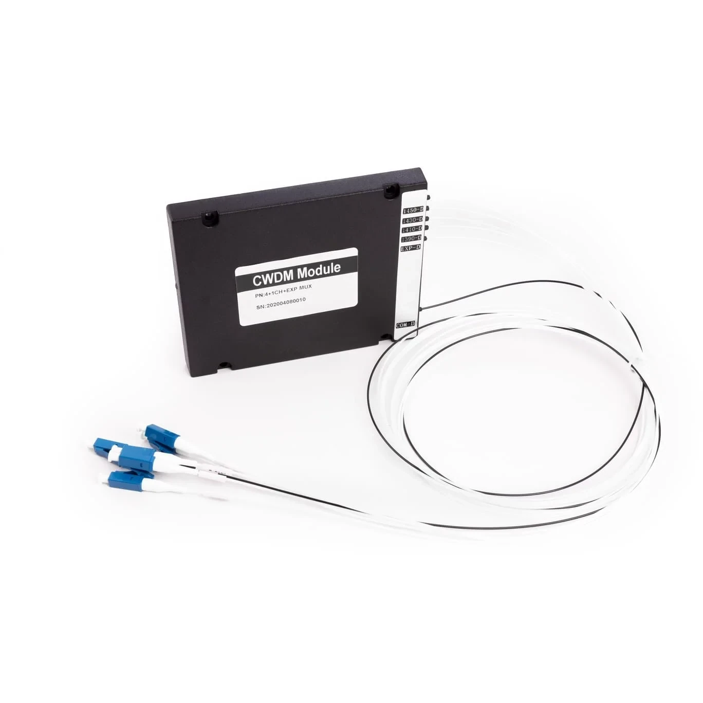 NG OPTICS CWDM 1x4 TX1290-1350нм MUX+EXT — мультиплексор CWDM. CWDM (сoarse wavelength division multiplexing — грубе спектральне мультиплексування каналів) — це метод об'єднання декількох сигналів в пучках лазерного випромінювання на різних довжинах хвиль для передачі по оптоволоконним кабелях. Кількість каналів CWDM менше ніж в DWDM (dense wavelength division multiplexing — щільне спектральне мультиплексування каналів), але більше ніж в стандартній технології WDM (wavelength division multiplexing — спектральне мультиплексування каналів).