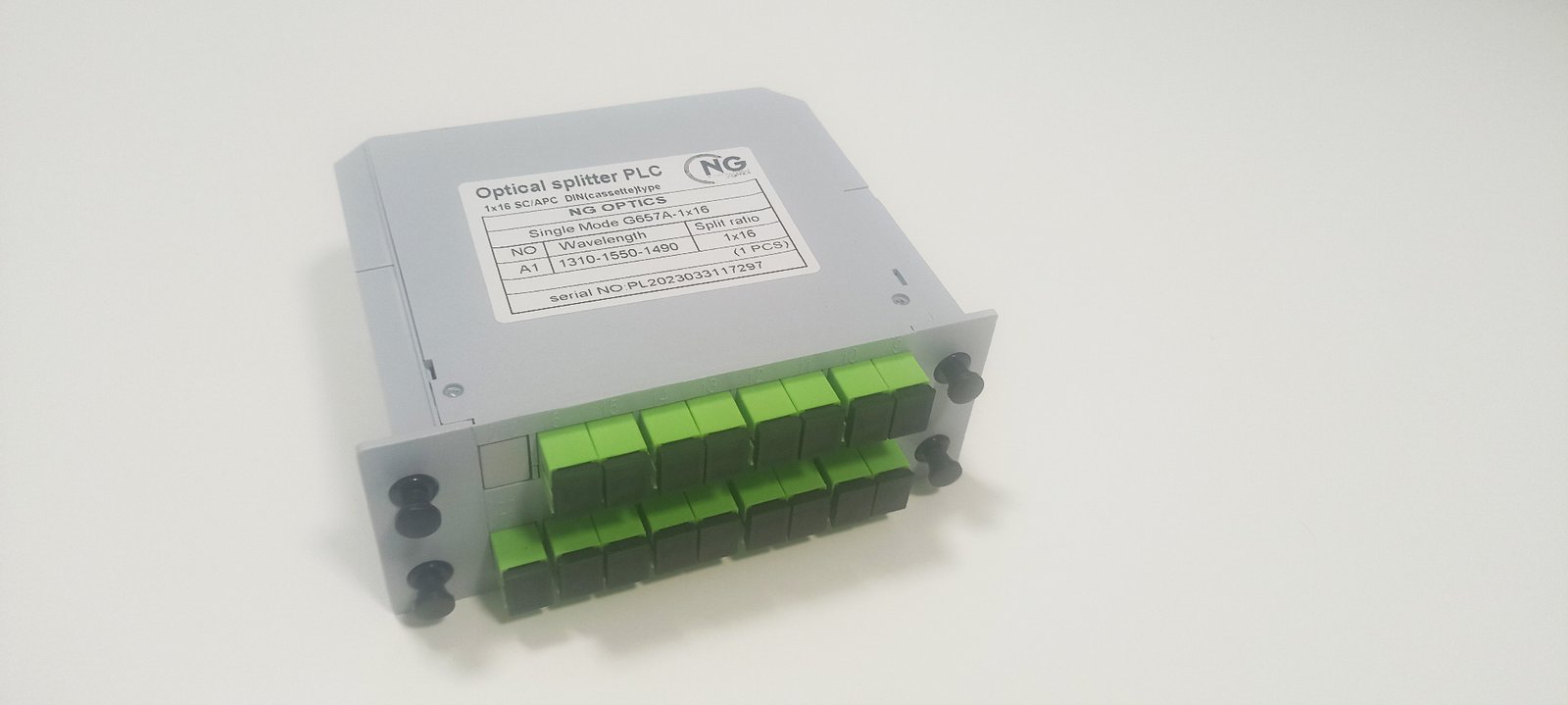 Оптичний дільник DIN (касета) NG OPTICS 1*16 SC/APC на основі технології PLC працює в діапазоні довжин хвиль 1260-1650 нм. Дільник рівномірно поділяє потужність оптичного сигналу з вхідного порту на вихідні порти. Дільник оптичної потужності можна використовувати у зворотному напрямку для поєднання оптичних сигналів з вихідних портів у вхідний порт.
